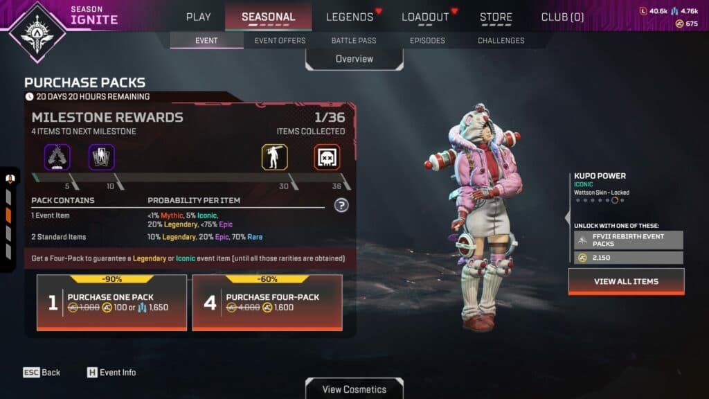 There are two ways to unlock the Final Fantasy Apex skins. The six iconic level skins can be purchased with Apex coins. They cost 2150 coins each. The rest of the skins and cosmetics in the event can only be unlocked with the event packs.