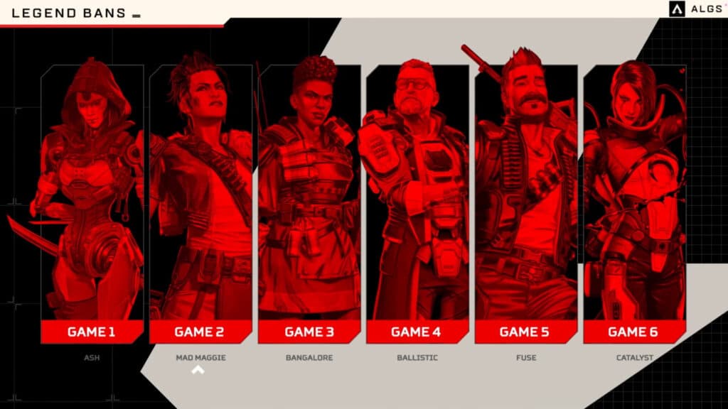 Legend Bans will take place after every game across a series. All Legends will be avaliable to be chosen when a series starts. Then, after each match, the most picked Legend in that game will be removed from the pool of avaliable Legends for the remainder of a match series.