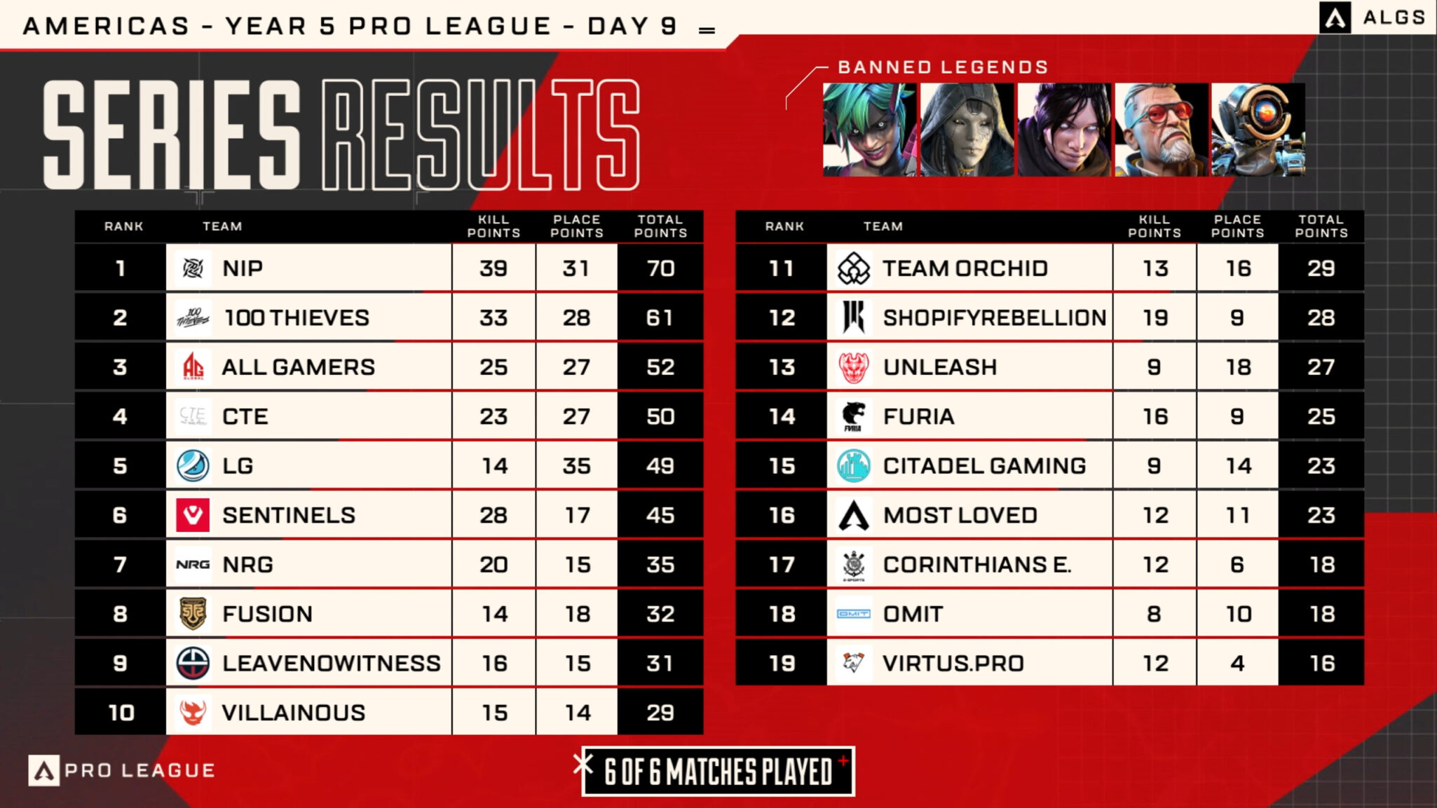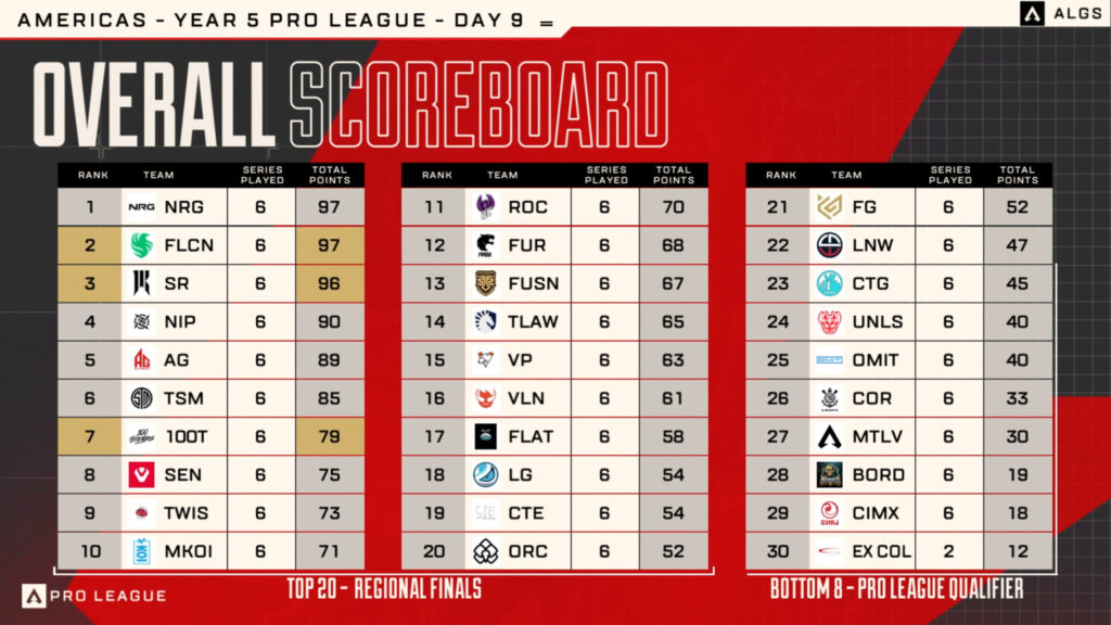Now, they are potentially even in with a chance at taking home the Pro League title next weekend. They sit just seven overall points behind Falcons and NRG in fourth overall. The new for Year 5 Americas region is one of the most competitive in the games history. The performance of teams like Ninjas in Pyjamas show why this region is considered the best in the ALGS.