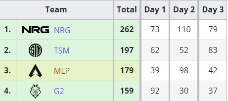 This is in response to the sheer dominance of NRG and TSM during the group stage. Both teams respectfully scored 262 and 197 points over the 3 days. NRG consistently racket up tons of points throughout the 3 days.