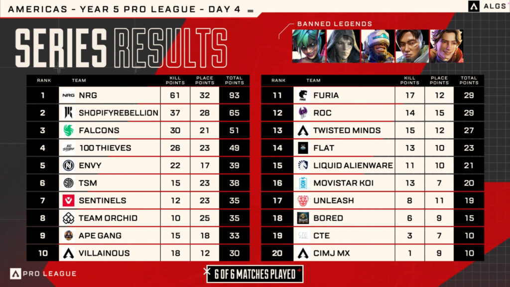 Apex Legends competition can be absolutely nail biting, with tiny decisions causing huge swings in the standings. Today, in America, was not one of those days. NRG started with 28 kills in two games, also posting a second place finish and immediately found themselves in pole position on the leaderboard.