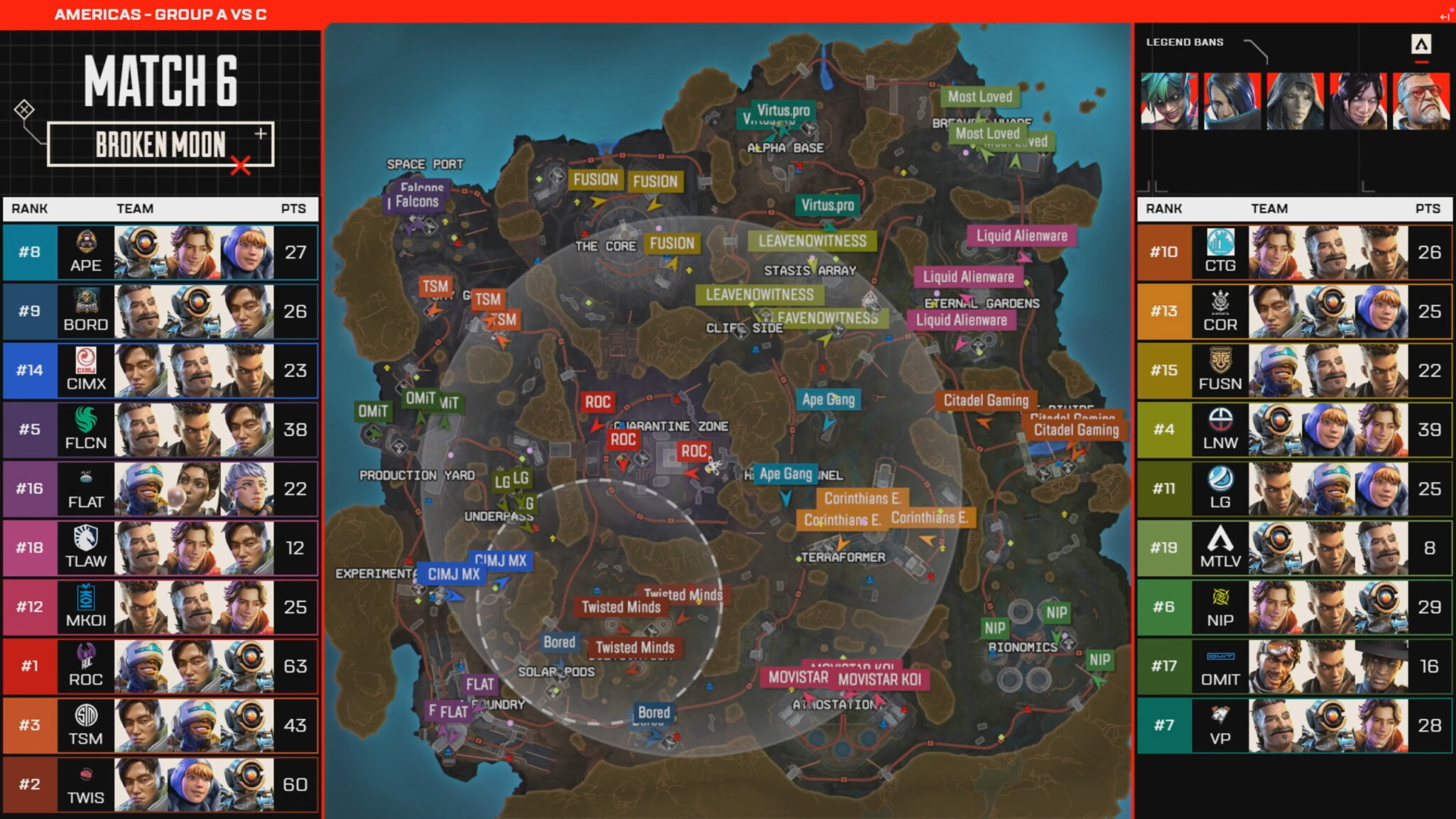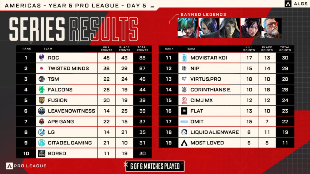 Team Falcons and TSM failed to put up the points they needed to close the gap to the top two, and when Twisted Minds were eliminated in eighth, that handed the win for the day over to ROC.
