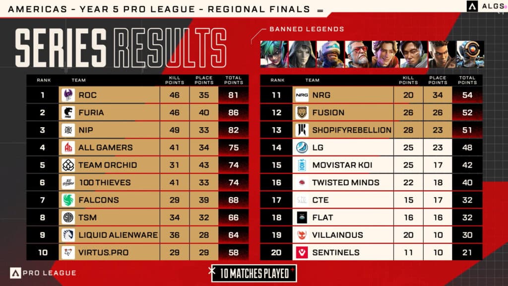 ROC Esports were the eventual winners of a thrilling ten-game long ALGS Regional Finals in the Americas region. They were finally able to close out a victory, navigating a chaotic final circle on E-District. This was the first Regional Finals we have seen with the new Legend Ban system, and both EMEA and Americas produced some of the most entertaining regional Apex we have seen in years.