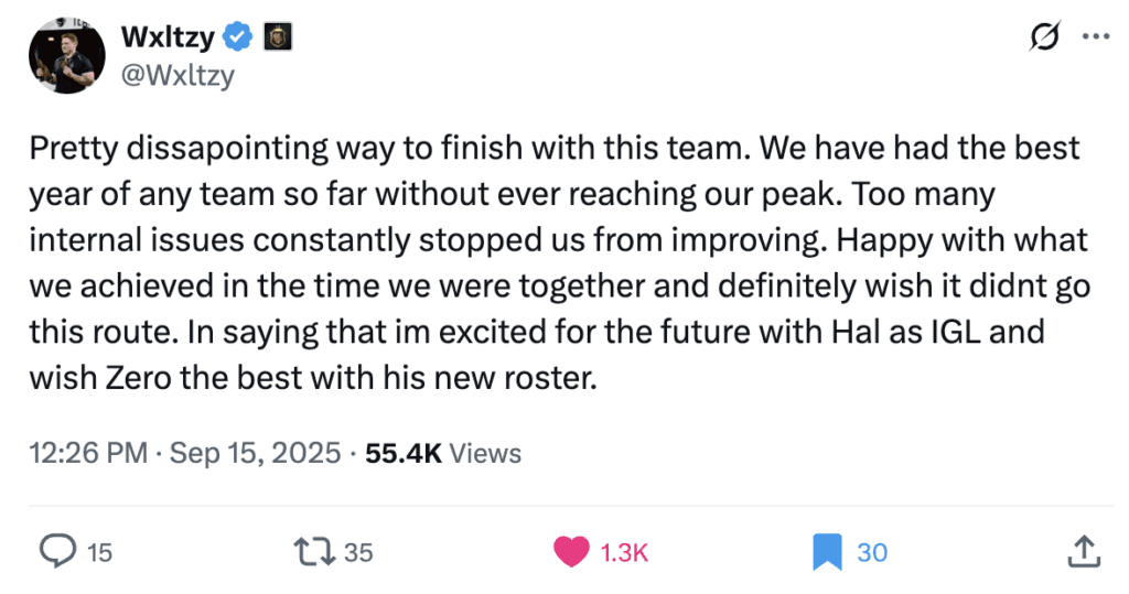 "Happy with what we achieved in the time we were together and definitely wish it didnt go this route. In saying that I'm excited for the future with Hal as IGL and wish Zer0 the best with his new roster."