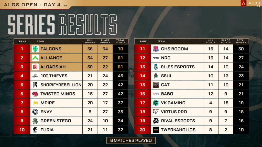 The ALGS Open format contained a LOT of Apex Legends matches, and Team Falcons experienced exactly how much Apex you can have to play. They fell into the Elimination Bracket, which resulted in a brutal run of games yesterday.