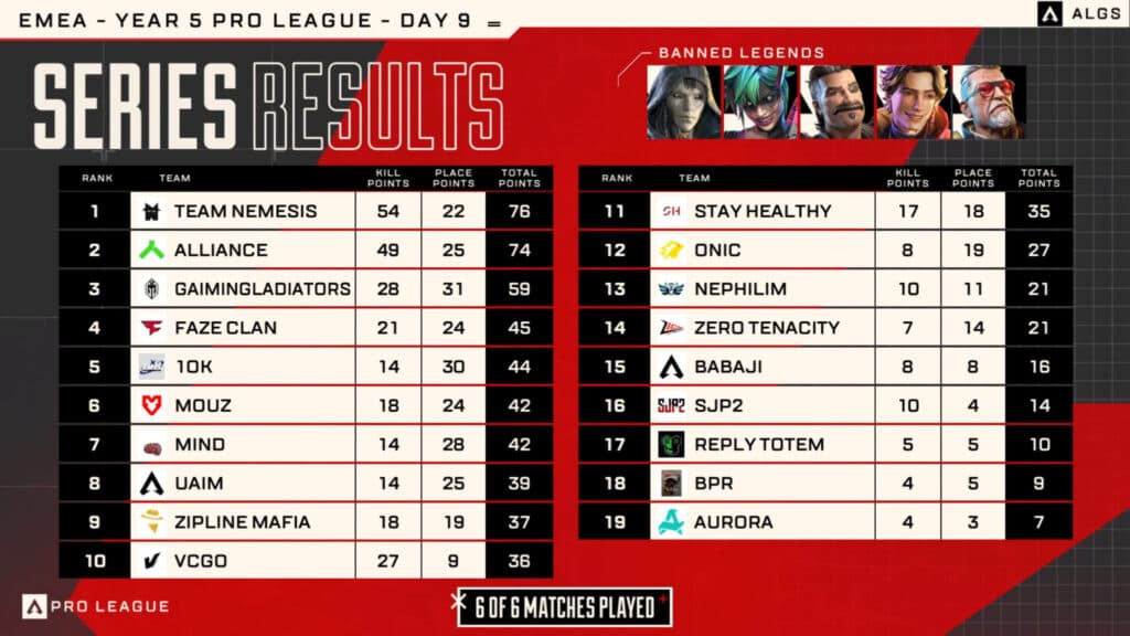 Team Nemesis denied Alliance a fourth consecutive ALGS Pro League win, racking up a phenomenal amount of kills in the final set of matches ahead of the EMEA Regional Finals.