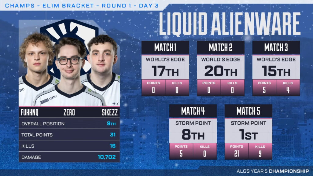 By this point, it looked like Zer0 and his squad were going to make it. However, in the series closer, they placed 19th. Team Liquid only accumulated 31 points, meaning they were among the first 10 teams eliminated from ALGS Year 5 Champs.