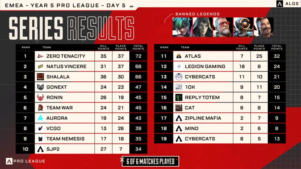 They stormed from 11 points behind heading into the final game, catching both NAVI and Shalala by surprise securing enough points to surpass both teams. This lifts Zero Tenacity up eight places in the overall ALGS Pro League standings in EMEA.