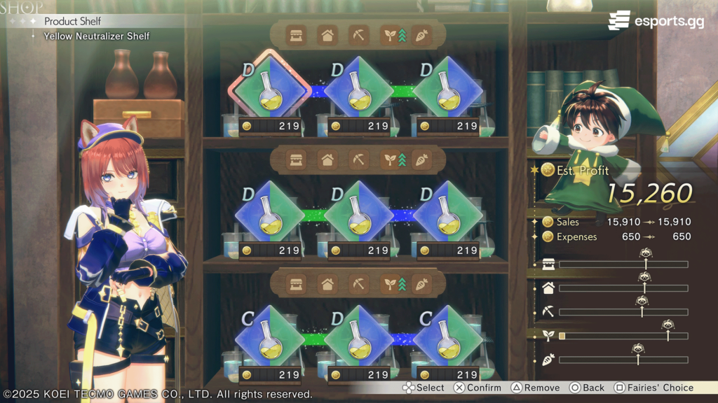 Don’t forget: upgraded items sell for even higher prices, especially if you link Gift Colors correctly. And if choosing what to stock feels like a drag, you can always let the system handle it with “Fairies’ Choice.” Just be careful… the auto-fill can sometimes include combat gear you’ve unequipped, and you don’t want to accidentally sell something valuable.