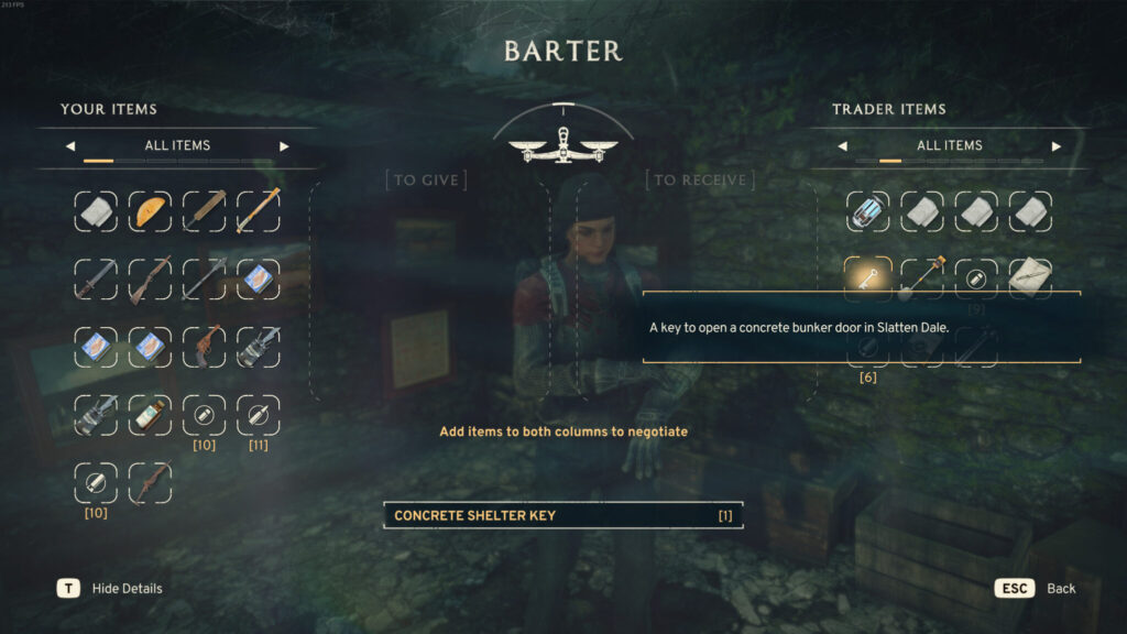 In my case, I was forced to give up two weapons, a knife and a cricket bat, to get the key. However, I also threw in a bottle of Painkillers and a Nail Bomb to also score three Bandages, a Flashlight, a Metal Detector, and eight rounds of ammunition. I highly suggest picking up the Flashlight and Metal Detector, as these are key tools that make your life easier in Atomfall.