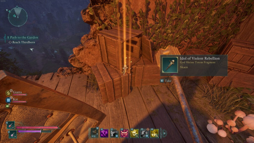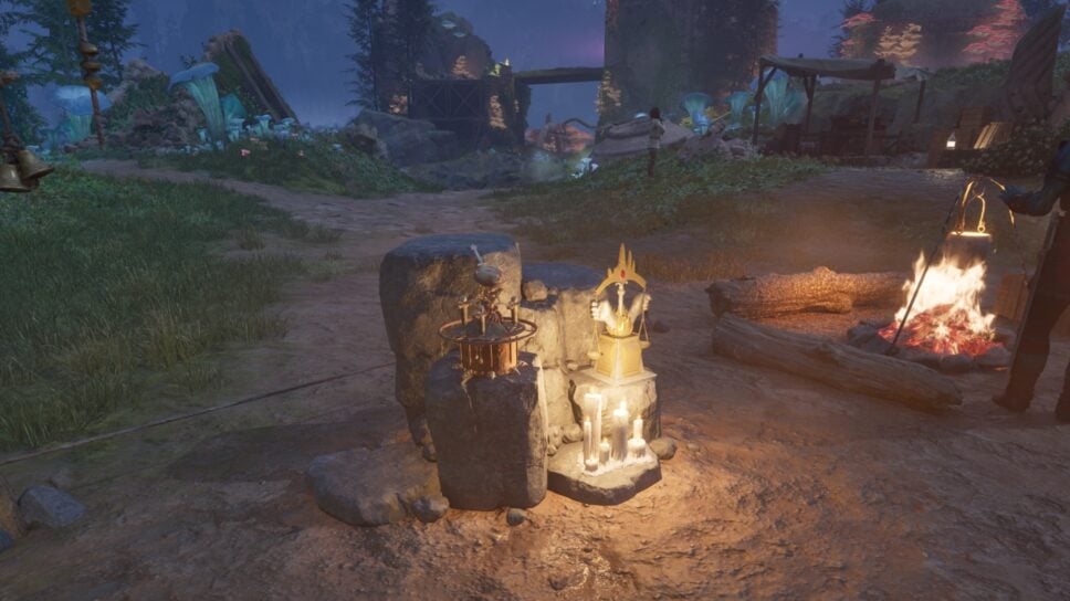 Once you have all seven Totem of Defiance pieces, fast travel to any party camp Waystone and set up camp. In camp, go to the totem rock formation next to the enchanting table. Place down the Totem Base and fill in the rest of the fragments. This triggers a cutscene between Skaen and Berath, which you can listen to and chime in with dialogue.