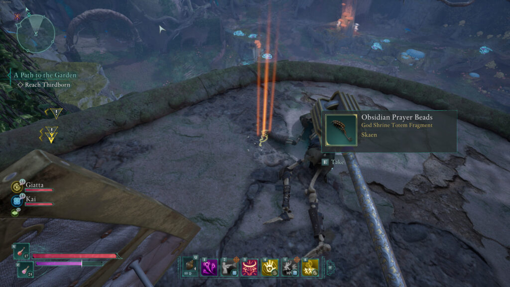 The Obsidian Prayer Beads are in the most dangerous location of any Totem of Defiance piece. You have to travel deep into the Delemgan Glade, which is located west of Fior mes Iverno. Inside the Delemgan Glade, head to the very back of the area and then climb on some rocks on the right side. Keep ascending the rocks until you can reach an overlook, where you’ll find the beads sitting in the clutches of a skeleton.