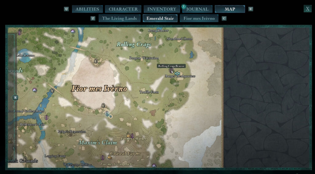 Fortunately, Practical Pockets isn’t located too far from Fior mes Iverno and it has a fast travel beacon right by its location. To start, you want to fast travel to the Ranger Headquarters fast travel beacon. If you don’t have that beacon unlocked, you can make your way to the Ranger HQ by heading out of Fior mes Iverno and traveling east. Ranger HQ is located southeast of the Rolling Crags for further reference.
