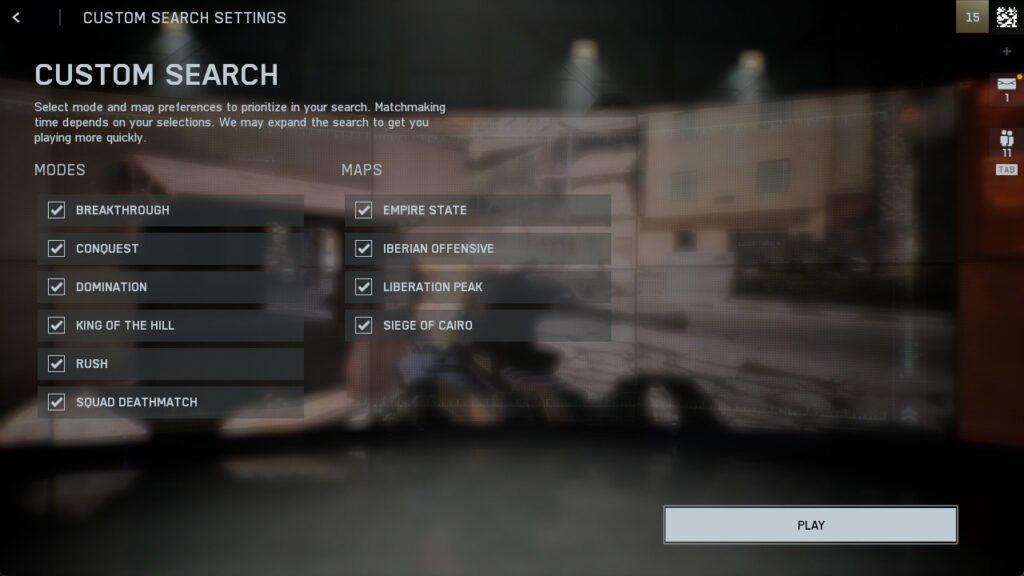 So, for example, if you want to play Conquest on Liberation Peak (so you can snipe from the mountains), all you have to do is enter those preferences into the Custom Search feature that’s available from the main menu. Then, you can matchmake, and the game will prioritize your choices when trying to find a match for you. This will, naturally, lead to longer wait times in between matches, but it’s a decent way to ensure you get what you want when looking for a match.