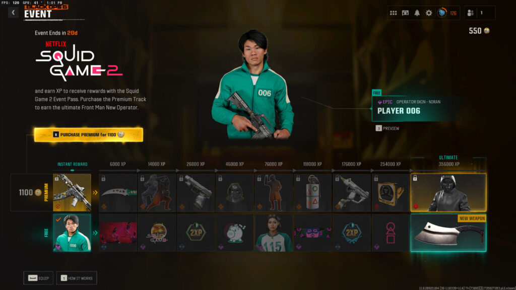 As you can see, it will take 356,000 total XP to unlock all rewards in the Squid Game event. If you purchase the Premium Track, you’ll unlock two rewards at every XP milestone while Free Track players just unlock one.
