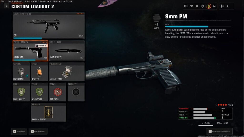 Moving on in your loadout, your next task is to select the proper secondary weapon. Starting out, the best option by far is the 9mm PM pistol, which is also unlocked by default. This semi-auto pistol is fantastic at all ranges.