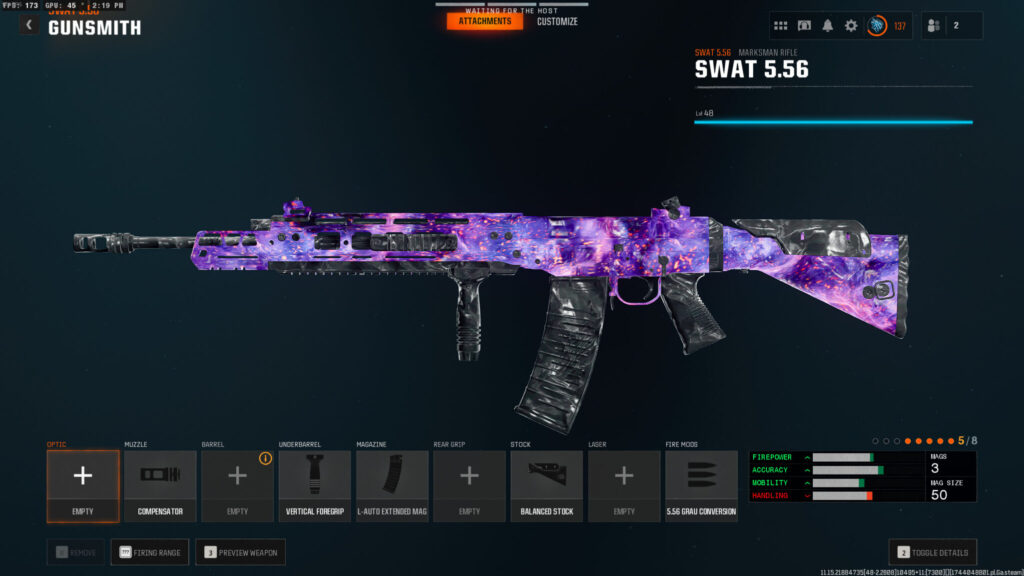 For the rest of the loadout, we’ve gone with the Vertical Foregrip for superior horizontal recoil control and the Balanced Stock to slightly boost mobility when running and when aiming down sights. Next, we’re using the Full-Auto Extended Mag, bumping up your magazine size to 50 bullets. This also converts your shots to fully automatic instead of semi-automatic, which is the default for the SWAT 556.