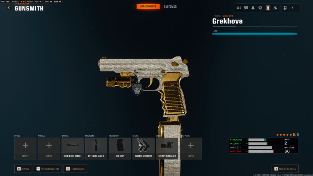 To equip the Grekhova after you’ve unlocked it, go to the loadouts menu, select a class, and then click the secondary slot on a loadout. From there, find the Grekhova, select it, and you can now add attachments to it.