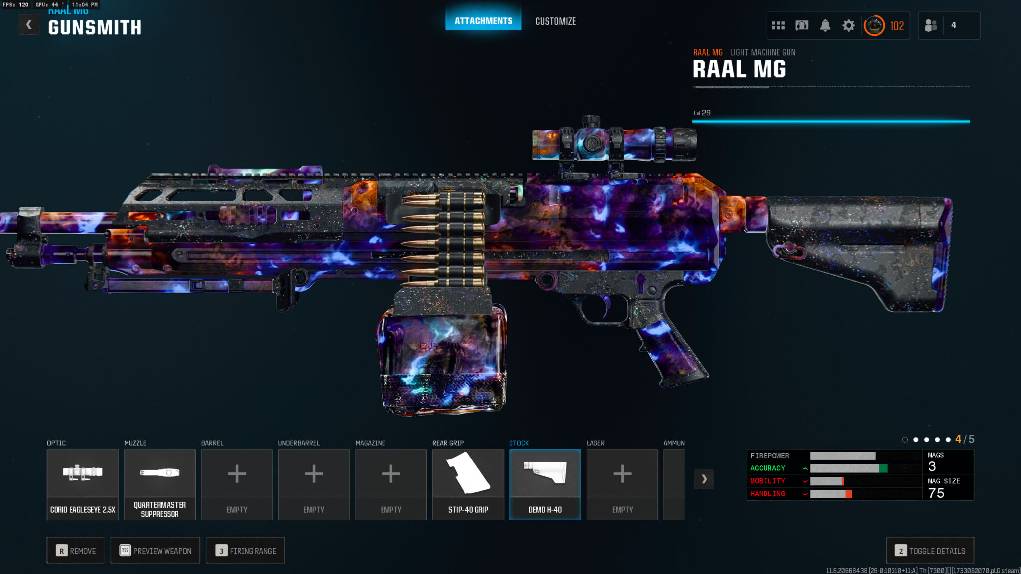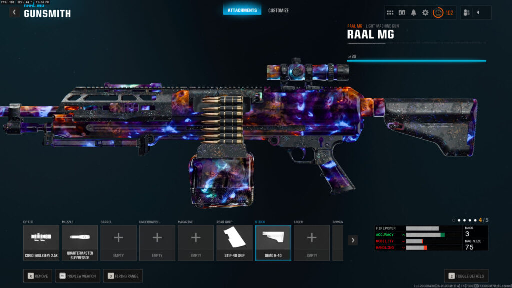 Something else to note is the Quartermaster Suppressor, another attachment on the loadout, might also need to be unlocked through the Armory if you didn’t unlock it during MW3. The rest of the loadout’s attachments come standard on the RAAL MG, so you just need to level the LMG up to use them.