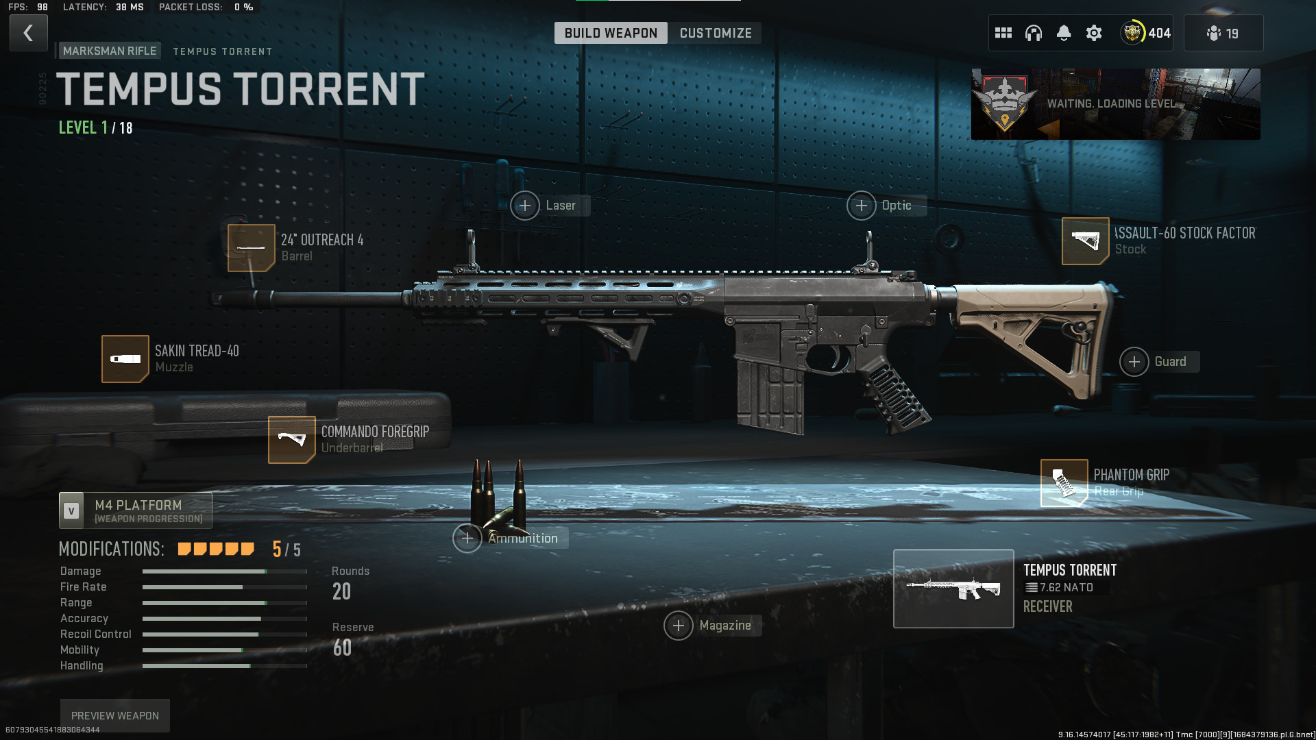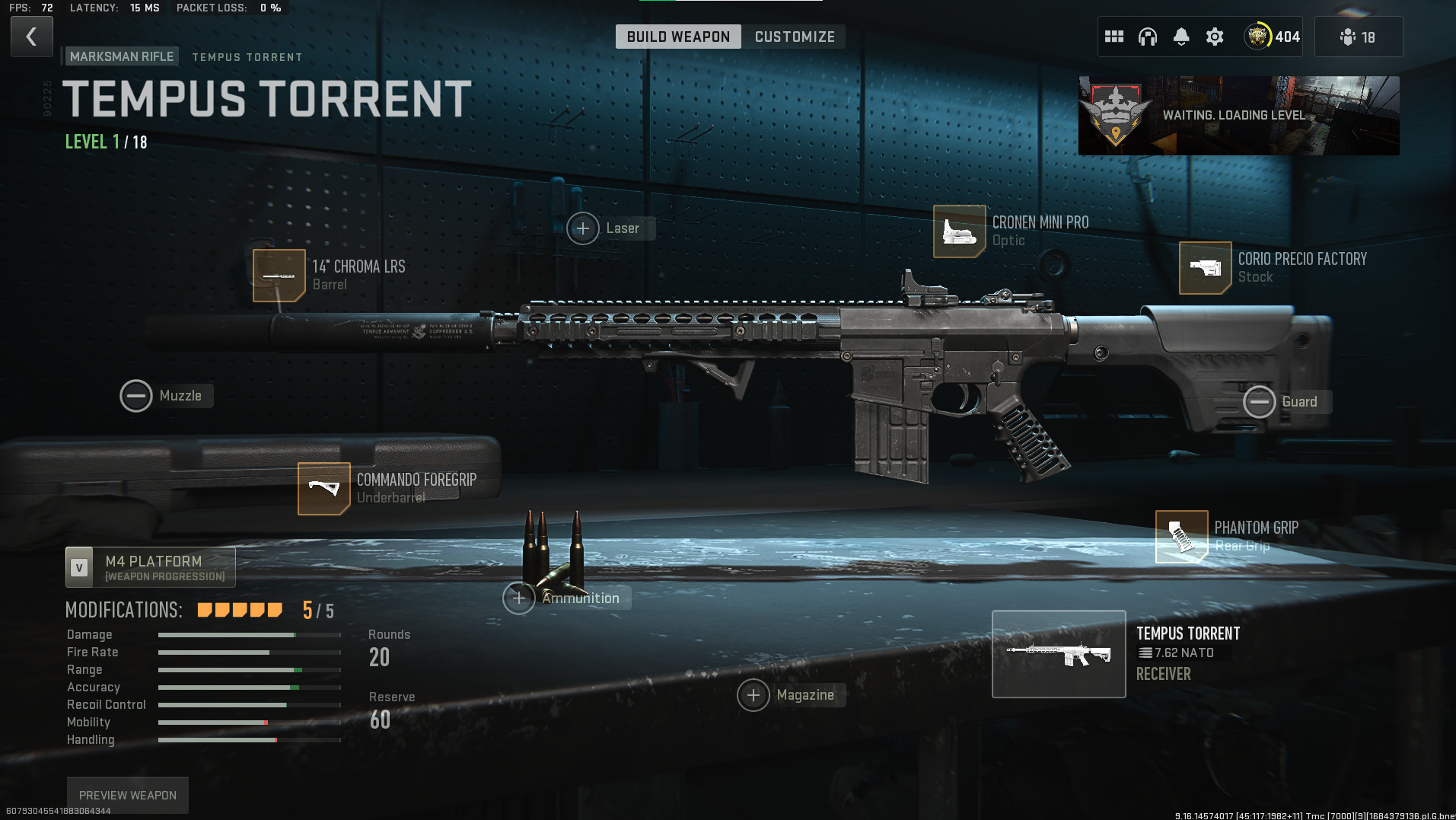 In our multiplayer version of the loadout for the Tempus Torrent, we change the stock and the barrel to allow for more mobility.