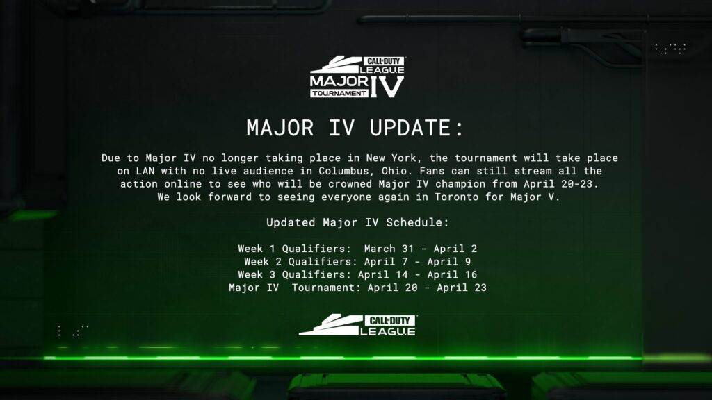 Call of Duty League Major 4 will now take place in Columbus, OH. The event will have no fans but will remain to be in a LAN setting, with all 12 teams traveling to Ohio for the tournament.