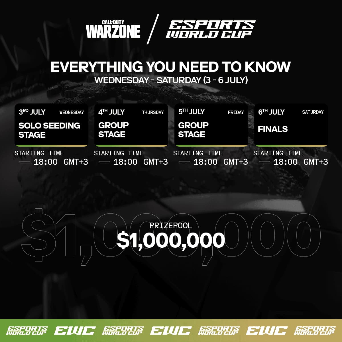There are four days worth of Call of Duty: Warzone action at the Esports World Cup. It takes place during the event’s first week and kicks off at the following times: