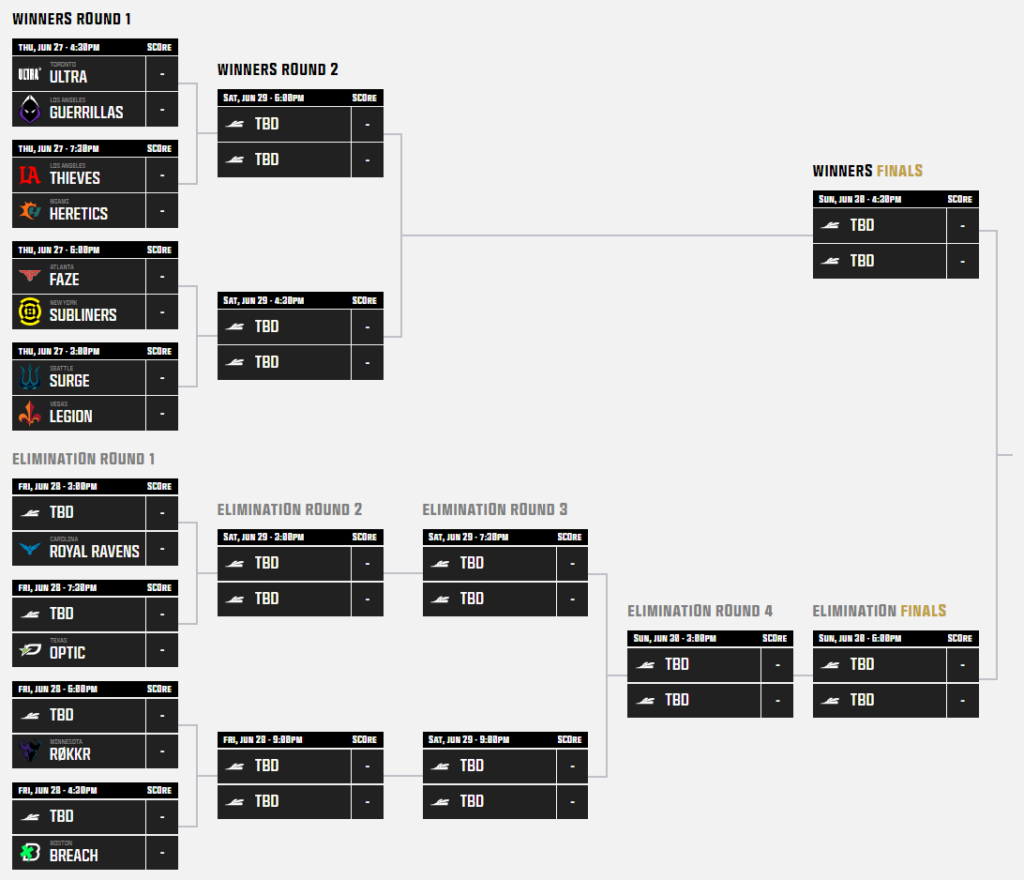 These eight teams will compete on June 27, and the rest of the bracket will play out through Championship Sunday on June 30. Here is the tentative match schedule at CDL Major 4 as it stands: