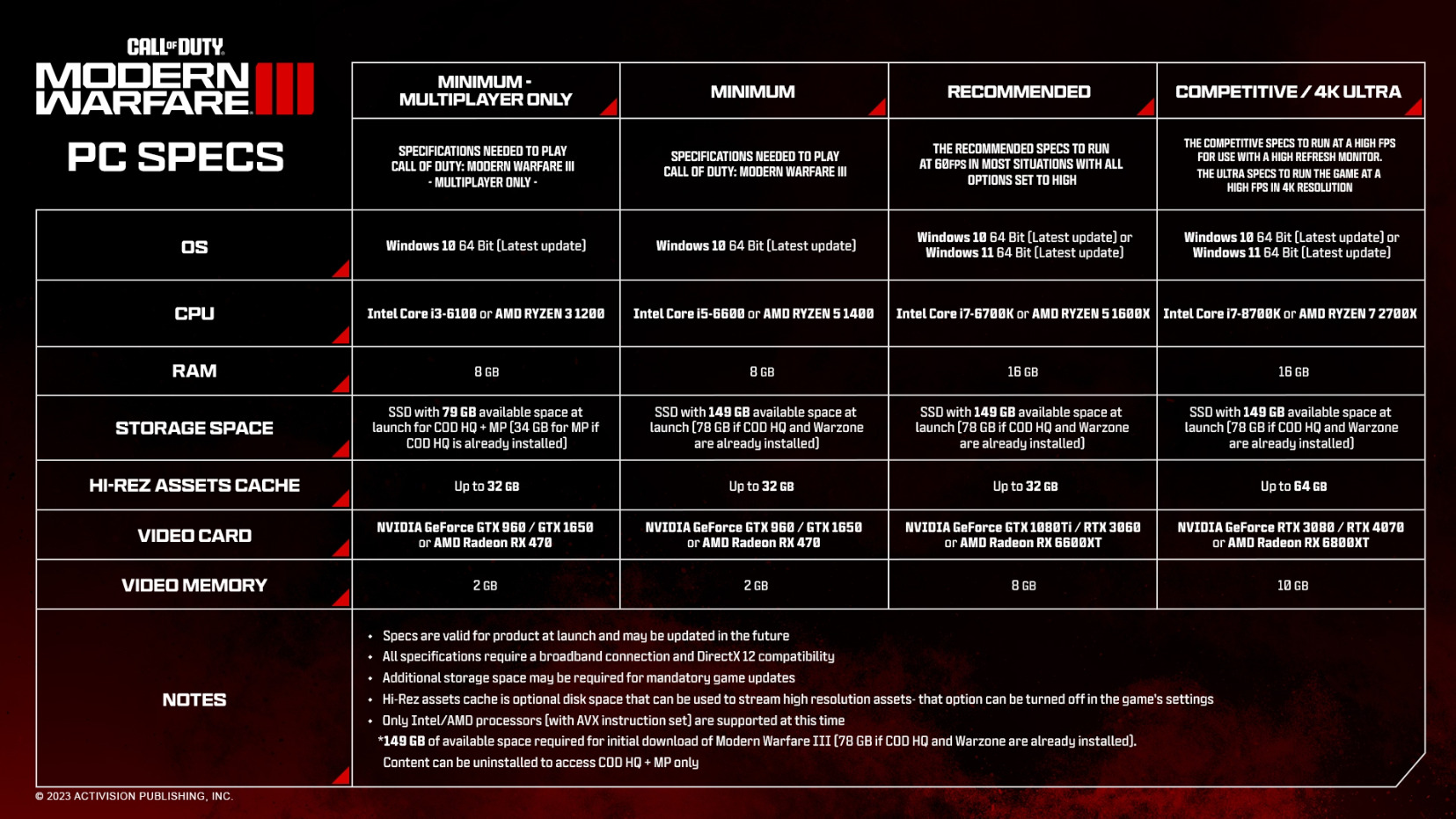 The Call of Duty: Modern Warfare 3 PC requirements and specs come in a wide variety of options. This includes minimum, recommended, and competitive/4K resolution options. Check out handy list and see where you fit on the chart. Safe to say, you’re going to need to upgrade to at least a 3090 series card if you’re looking to pump out the best looking pixels.
