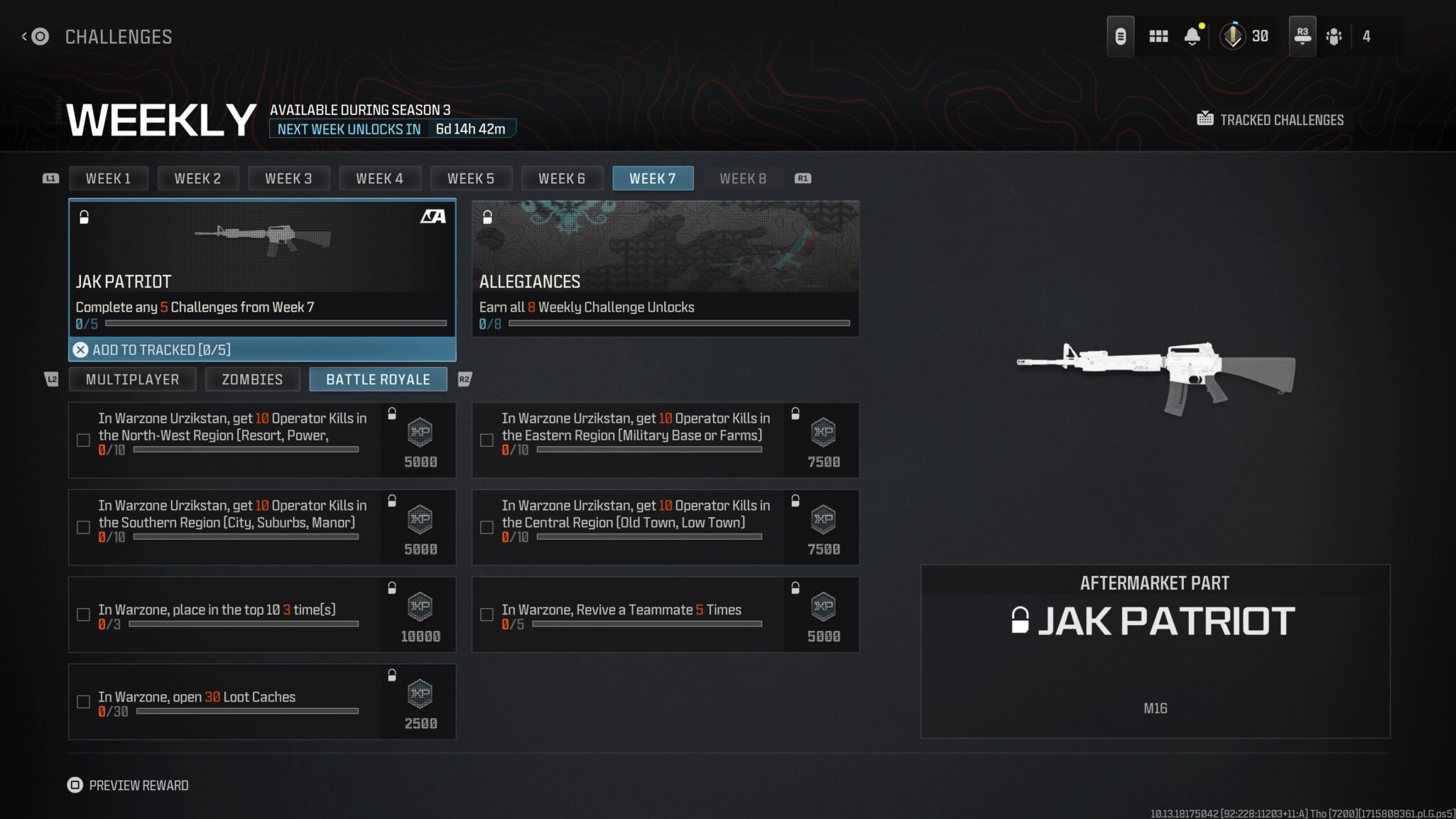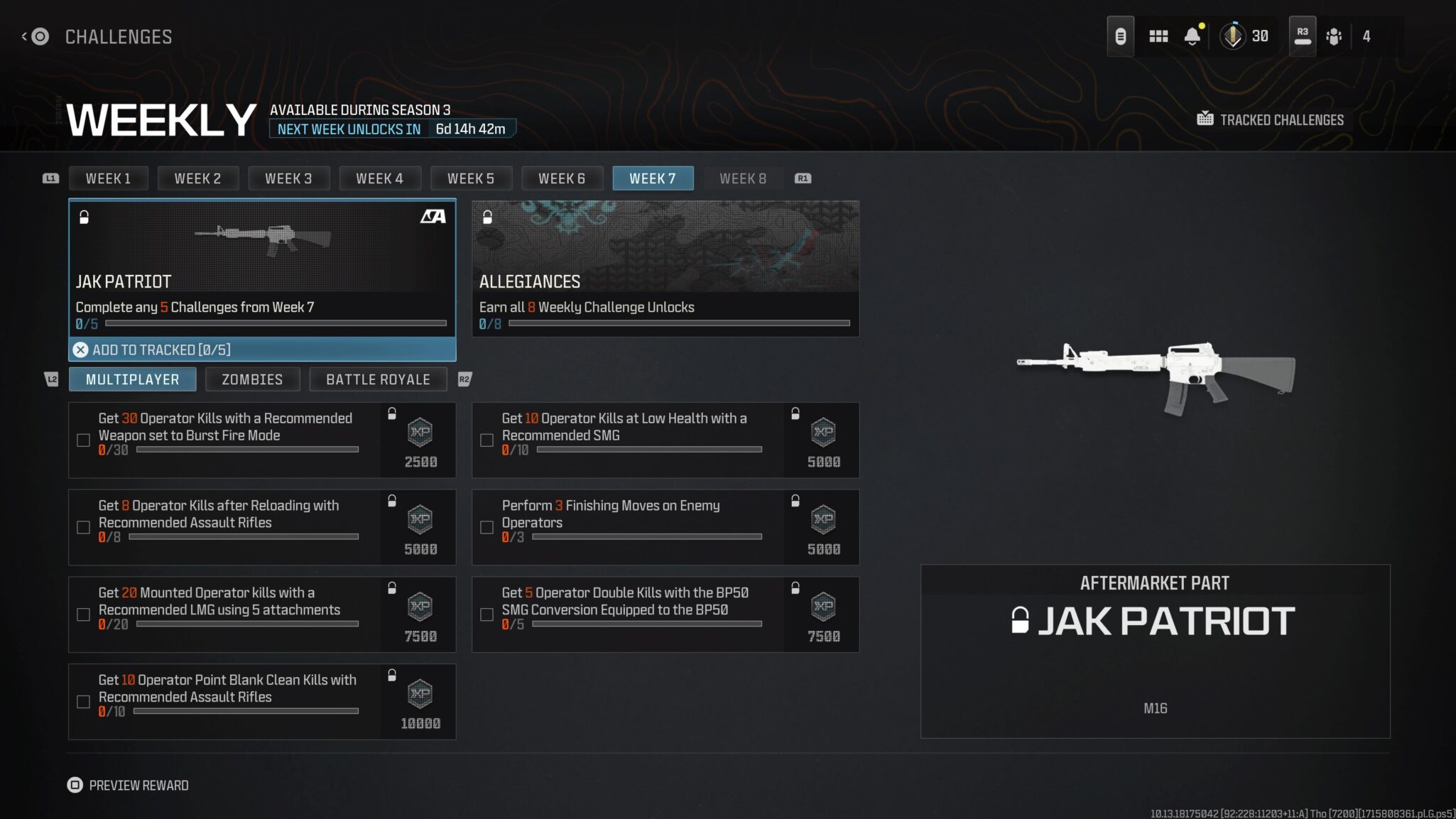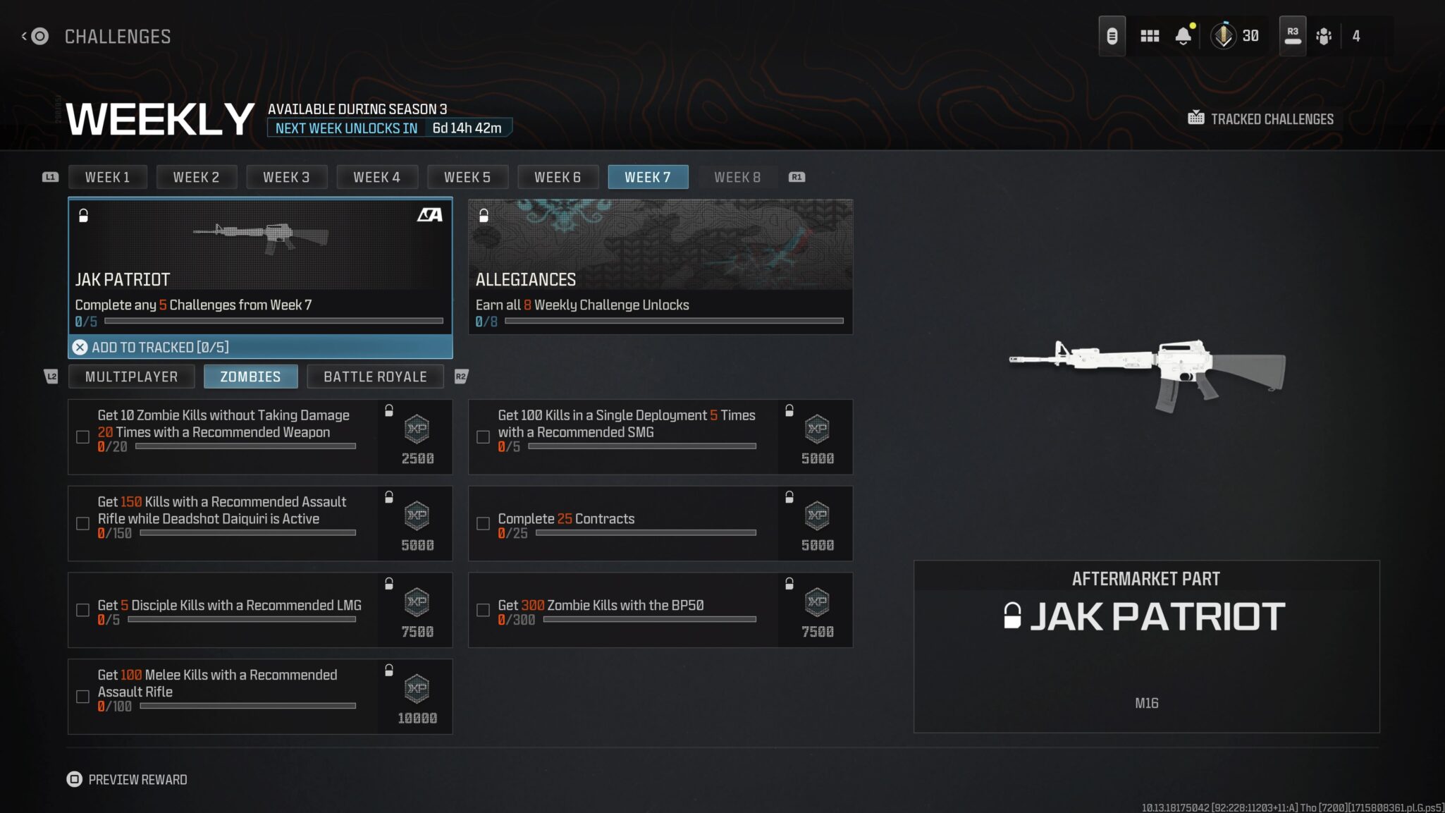 There are seven challenges for each of the game’s modes. You can get the JAK Patriot by completing any five of them for Week 7, from either MW3 multiplayer, Zombies, or the Warzone battle royale.