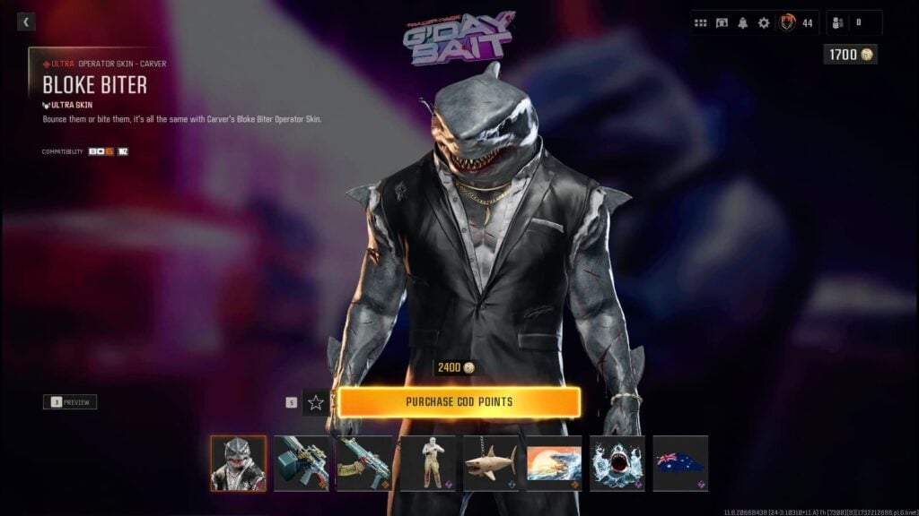 You need to buy the entire G’Day Bait bundle in Black Ops 6 to get the Shark Skin. It costs 2,400 COD Points. So, either save up your CP that you get in the Battle Pass or open up the purchase menu and add some COD Points to your account if you really want this Operator variant for Carver.