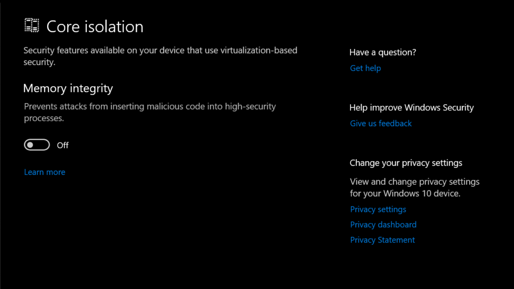 - This brings you to a menu in your Windows Settings where you’ll see an option called “Memory Integrity.”