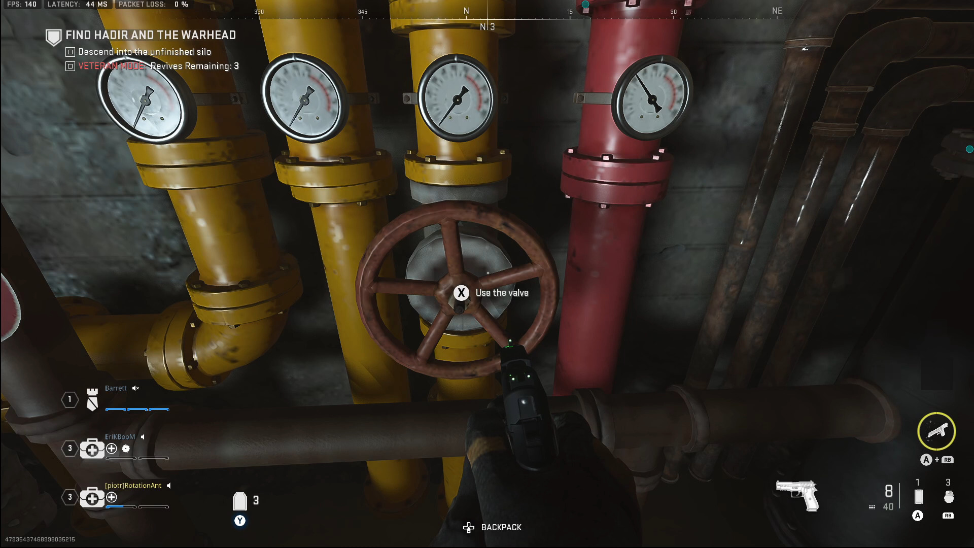 For the next part, we will have to go down to the next stop on the elevator. Hop off here and go into the room with the saw. On the left there is a valve that can be turned. The other two players in the team need to go down to the next level using parkour skills and find two separate rooms with other valves in.