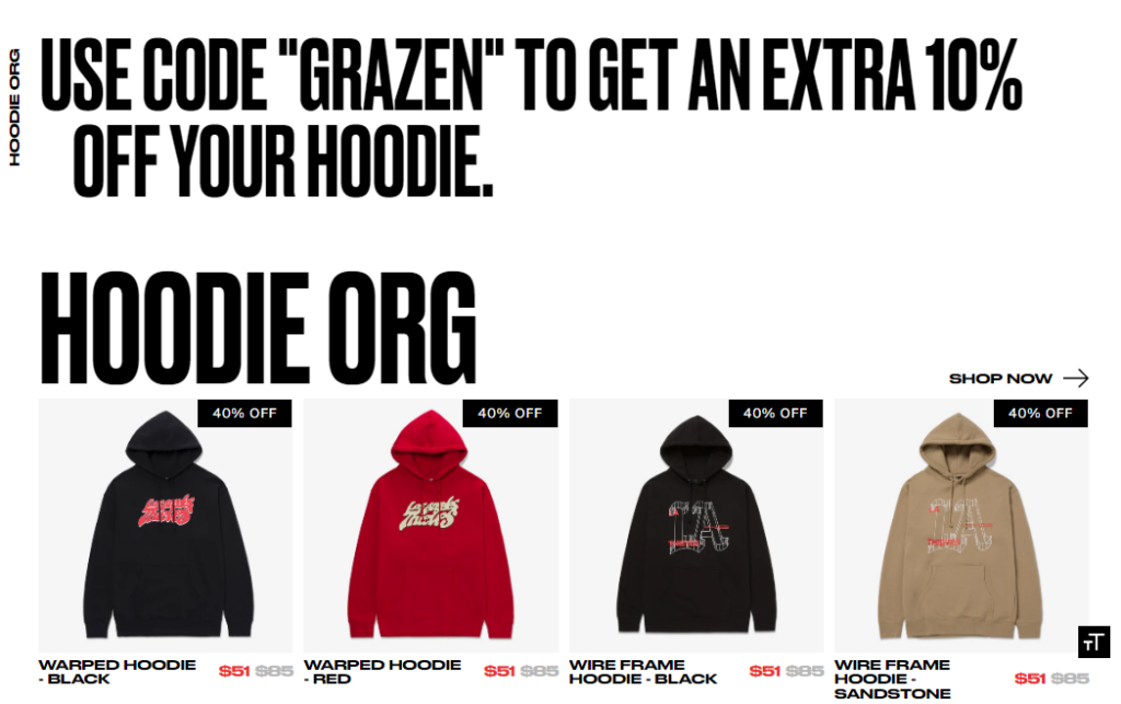 Shortly after Adamou made his comments on X, the LA Thieves account tweeted out a link to hoodieorg.org. The link redirects you to the 100 Thieves merchandise site, where you immediately see the following message: “Use code “Grazen” to get an extra 10% off your hoodie.” This goes along with every hoodie on the 100 Thieves site being discounted by over $30.