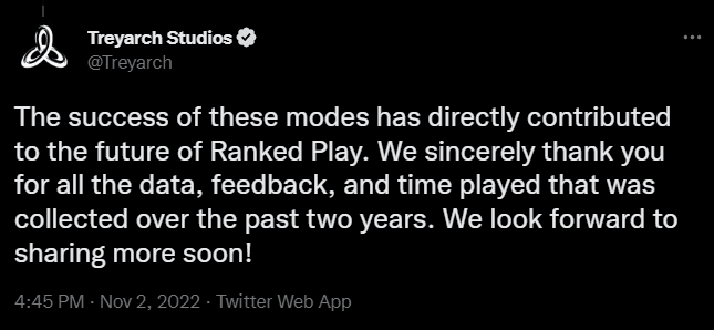 "The success of these modes has directly contributed to the future of Ranked Play," The Twitter statement continued. We sincerely thank you for all the data, feedback, and time played that was collected over the past two years. We look forward to sharing more soon!"