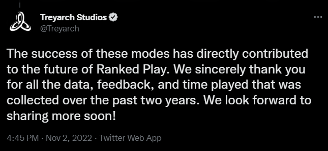 “The success of these modes has directly contributed to the future of Ranked Play,” The Twitter statement continued. We sincerely thank you for all the data, feedback, and time played that was collected over the past two years. We look forward to sharing more soon!”