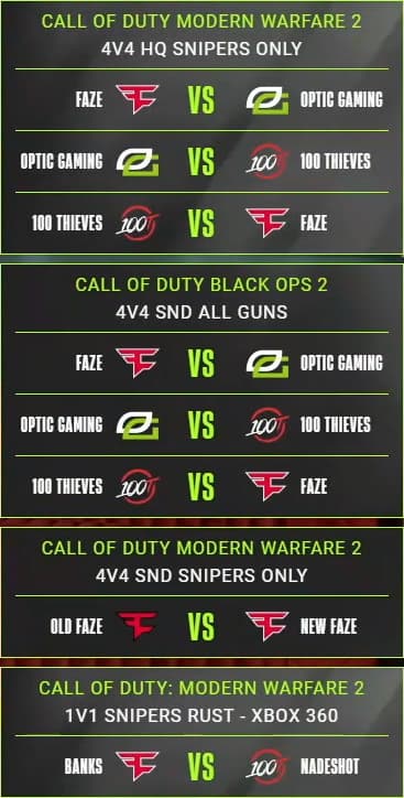 The undercard will feature 4v4 matches contested in Modern Warfare 2 (2009) and Black Ops 2 (2012). Although the participants are unclear, the main event is the 1v1 sniper battle between Nadeshot and Banks.