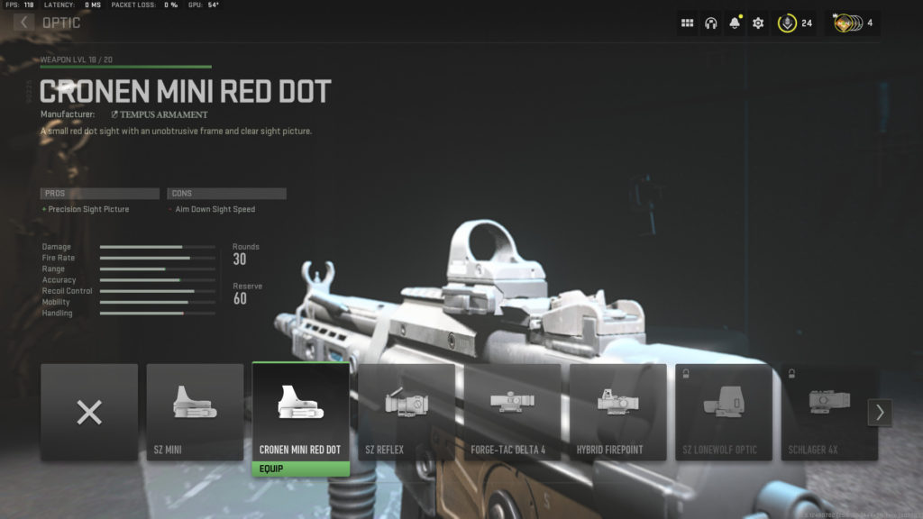 There are a couple of changes you can make to adjust the weapon for your individual playstyle. If you struggle to see enemies using the iron sights, then change the stock for the Cronen Mini Red Dot sight.