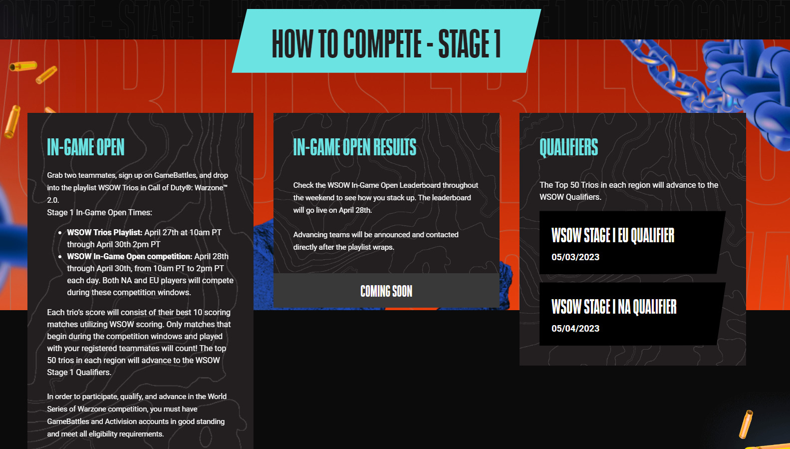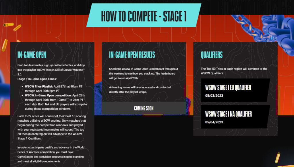 The first major tournament in Warzone 2 is massive, with a $1.2 million prize pool, a Trios format, and several ways to qualify. WSOW 2023 is split into two Stages for Europe and North America.