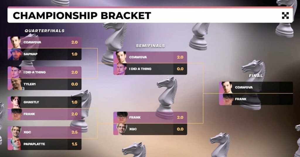 Here are the standings of the Championship Bracket. CDawgVA will clash against Frank in the Final round which will take place live in Los Angeles on August 17th!