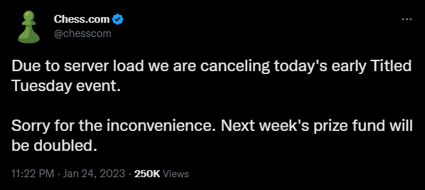 In response to the overwhelming visitors, Chess.com published a post to thank the vigorous player base and promised to fix the servers as soon as possible. The weekly Titled Tuesday tournament on Jan. 24 was also canceled and it will return the next week with a doubled prize pool.