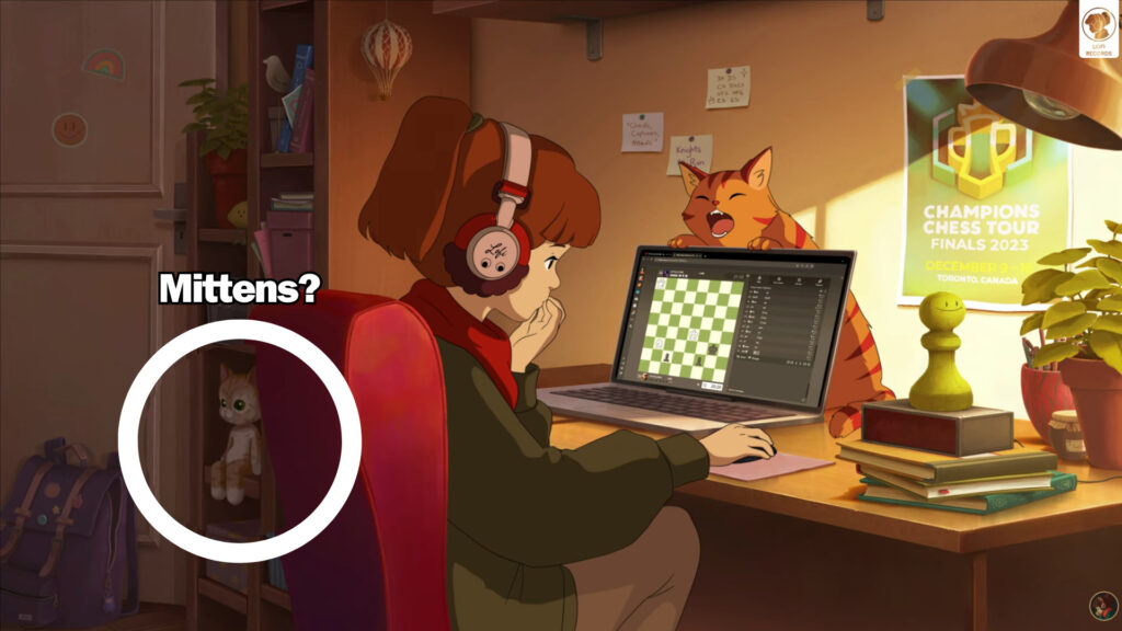 Chess.com recently collaborated with the popular music YouTube channel, Lofi Girl. The channel has brought forth an hour long playlist of chill beats that you can enjoy while playing chess. In the video, the Lofi Girl is seen playing on Chess.com and her room is filled with chess decorations. But a certain figure hidden beside the Lofi Girl seems familiar.. and it’s bringing us intense war flashbacks.