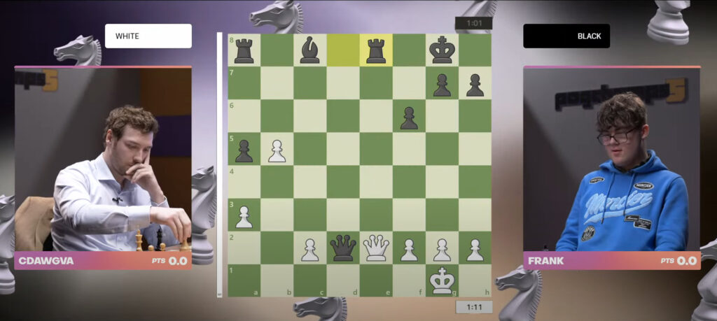 Game one started off intense with unexpected, drastic turns. Frank’s Black pieces had a solid opening and CDawgVA’s White pieces couldn’t develop well on the board. However, a trade showdown happened at the center of the board, involving both Queens and Rooks.