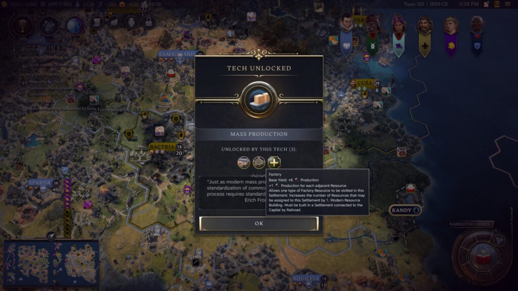 To start, Factories can’t be built until you research the specific Technology that unlocks the ability to produce them. This Technology is called “Mass Production,” and it became available to research for us around turn 100 in the Modern Age. However, we were playing on the “Epic” game speed, which will affect what turn certain tech and civics become available.