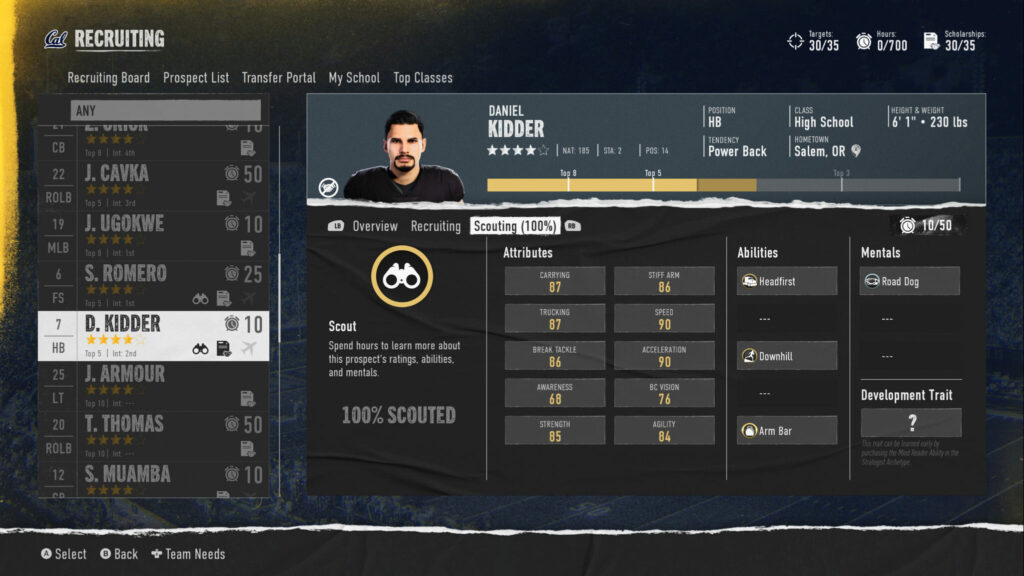 For non-skill positions, speed won’t necessarily be what you are looking for, unless you want a pass-rushing DE or something of that sort, but for skill positions, it’s vitally important. The most important thing is checking these stats once you’ve scouted to ensure the player fits into your team well and has solid baseline stats. Star ratings can, at times, be a bit misleading.