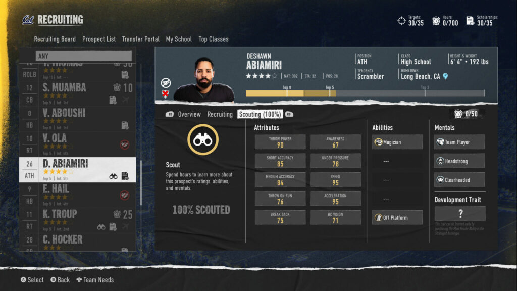 - Last is Deshawn Abiamiri, a 4-star broken gem ATH that would play QB. This is why you should not immediately disengage with broken gem players, as he has an incredible 95 speed and acceleration ratings, with 90 throw power and decent enough accuracy. This would be an extremely dangerous Scrambler QB and is a player I’ll be trying to get desperately with the Cal Golden Bears in this online dynasty.