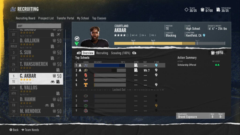 In Dynasty mode of College Football 25, you may have noticed that some of your recruits do not allow you to schedule a visit with them, despite being in their top five or top three. This is the recruiting bug that is currently unfixed and without a workaround, outside of committing large hours to the recruit and hoping for the best.