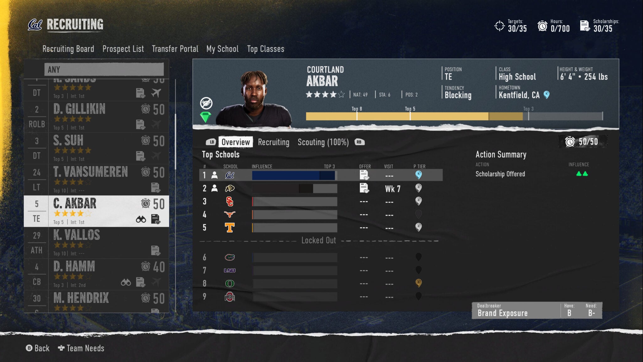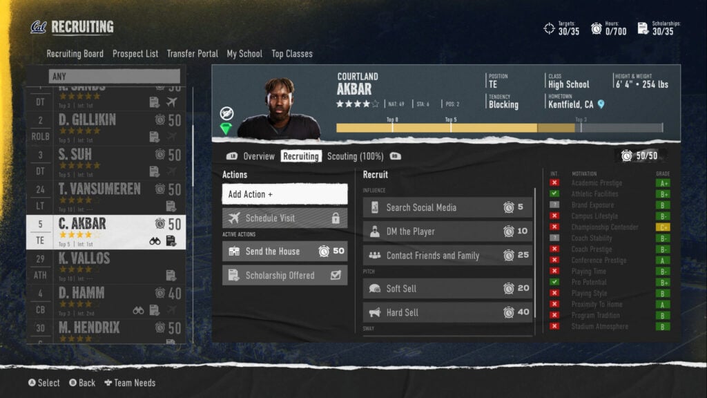The two images below, courtesy of esports.gg, show the bug in action with a TE recruit that we are going after in an online dynasty mode. Another user in the online dynasty was able to schedule with the TE, but when we try, the selection is grayed out. This has been the case for multiple weeks and will only go away if the recruit remains undecided going into the offseason. Luckily, we still have a lead on him.