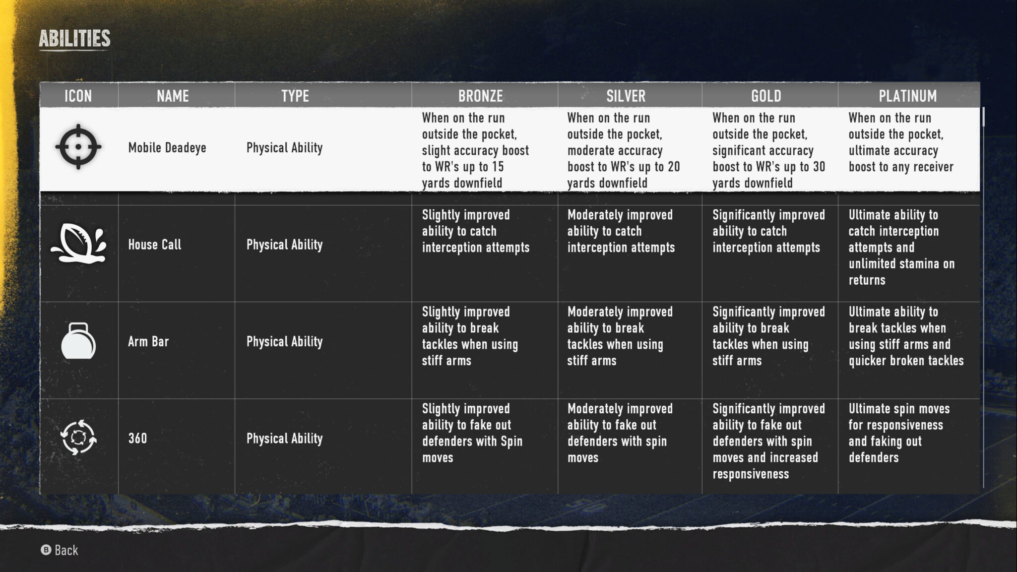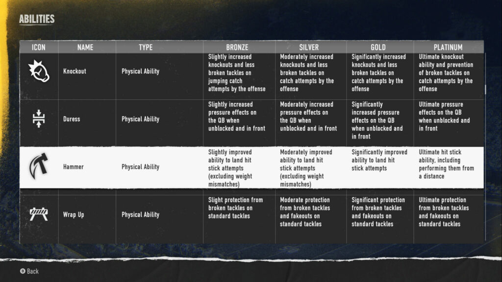 There are over 80 player abilities in College Football 25, according to the developers, each with four different tiers ranging from Bronze to Platinum that players can level up and progress. These abilities can be mental and physical, affecting a player’s ability to make a big play, stay composed, or tough out would-be injuries.