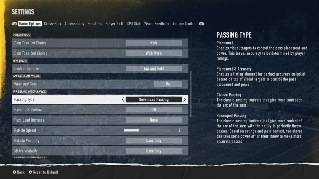 Passing is arguably one of the most important parts of the game. So of course, there are tons of settings related to the mechanic. However, the most important setting is the passing type. There are three different settings for Passing Type in College Football 25, and they are Placement & Accuracy, Classic Passing or Revamped Passing