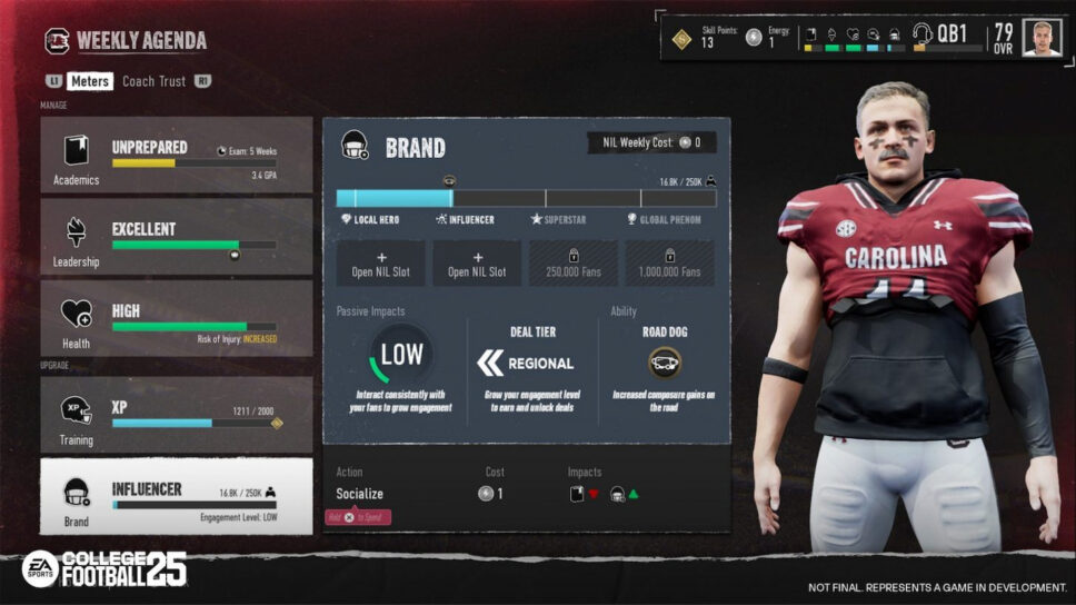 As your brand level grows in College Football 25 Road to Glory, you’ll unlock NIL deals slots. Essentially, once these slots are unlocked, you’ll start to receive offers to become an ambassador for various brands and earn rewards.